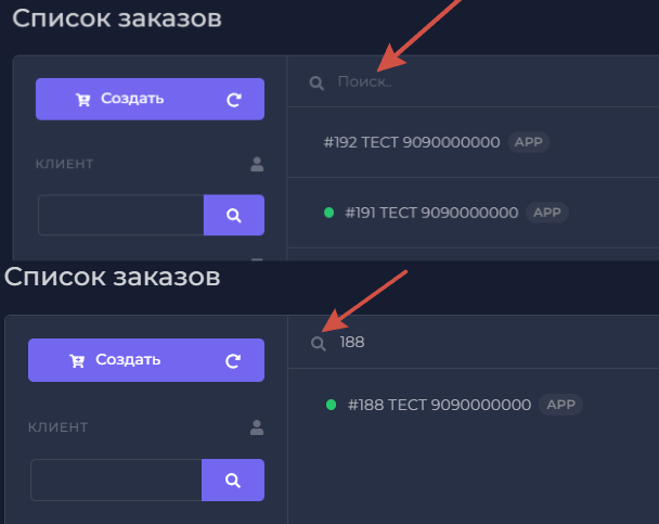 Поиск заказа по его номеру осуществляется с помощью поля над списком заказов.