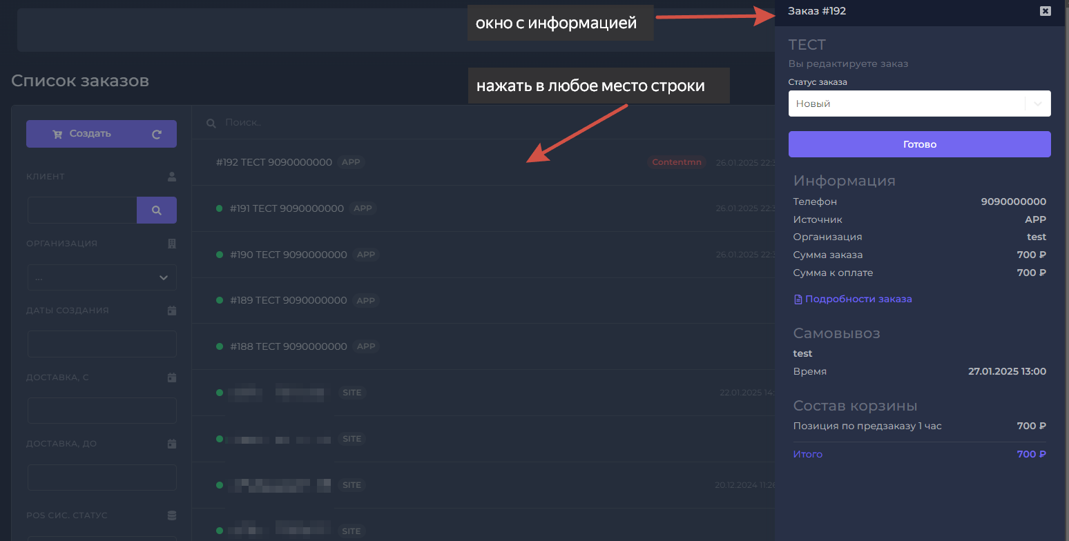При нажатии на строку заказа (в любое место, кроме кнопок справа), открывается боковое окно с подробной информацией о заказе и возможностью изменения его статуса.